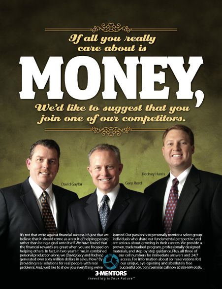 "Money" full-page ad (proposed) for 3-Mentors (annuity investment firm).