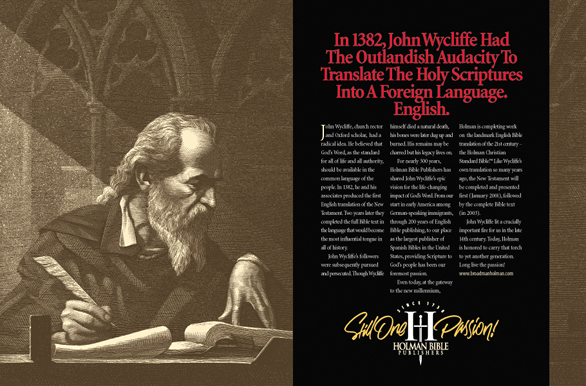"Wycliffe" two-page spread ad for Holman Bible Publishers. Illustration by Mark Summers.