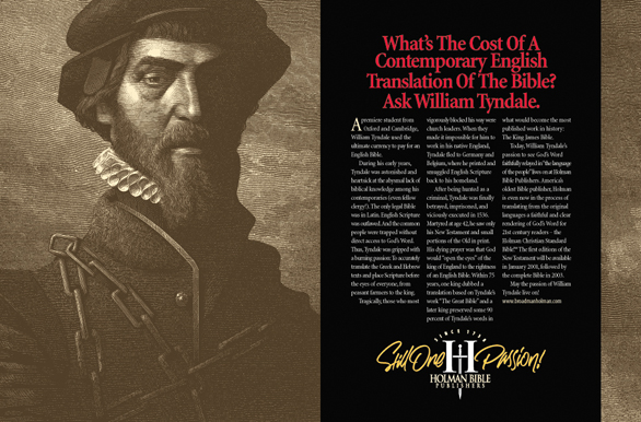 "Tyndale" two-page spread ad for Holman Bible Publishers. Illustration by Mark Summers.