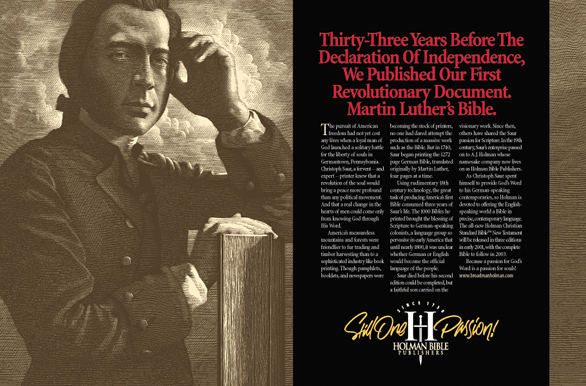 "Sauer" two-page spread ad for Holman Bible Publishers. Illustration by Mark Summers.